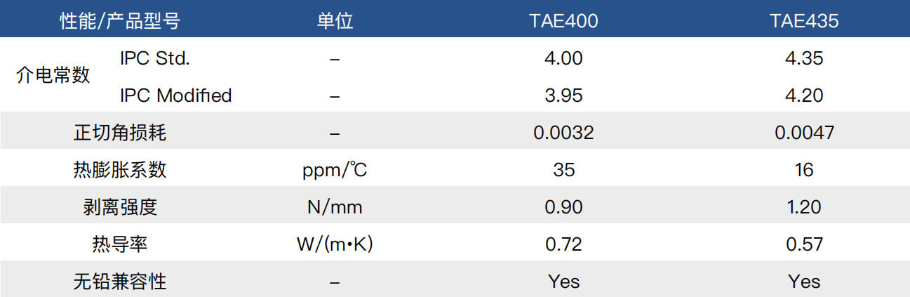 TAE系列是湍流电子开发的低成本型高频低损耗覆铜板。通过采用特殊的热固型树脂配方体系,该型材料拥有稳定的介电常数和更严苛的尺寸稳定性,以及低至0.004的介电损耗。同时,材料的玻璃态转化温度Tg>280℃,导热系数高达0.72W/(m·K)。